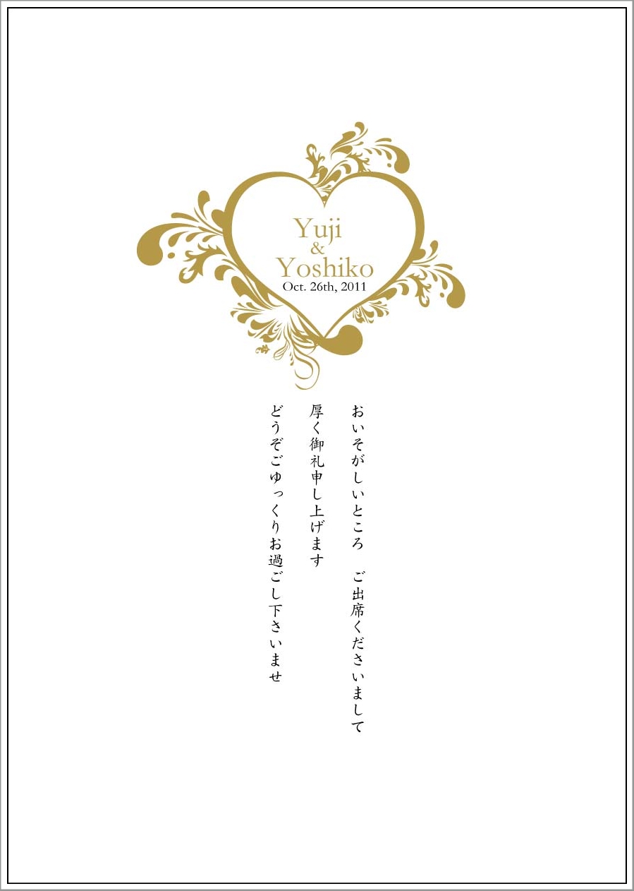 | 詳細 | 箔押しハートの中に、お二人のローマ字と挙式日が印字。四方の柄部分にはパールの箔押し加工。 ※お揃いのデザインの招待状・席札・メニュー表もございます。 |