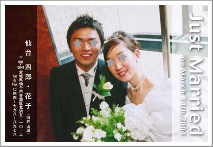 | 「Just Married」のバックの写真を薄く、 「お名前・住所」のバックの写真を暗くした お洒落な雰囲気のデザイン。 | |