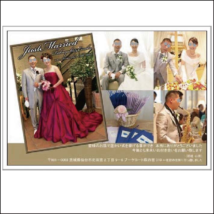 | 左にメインの写真を1点フレームに 入れた形で、右に4点の写真を使用。 以前より要望の多かった 「一言挨拶文章」を住所の上に 記載の形です。 |